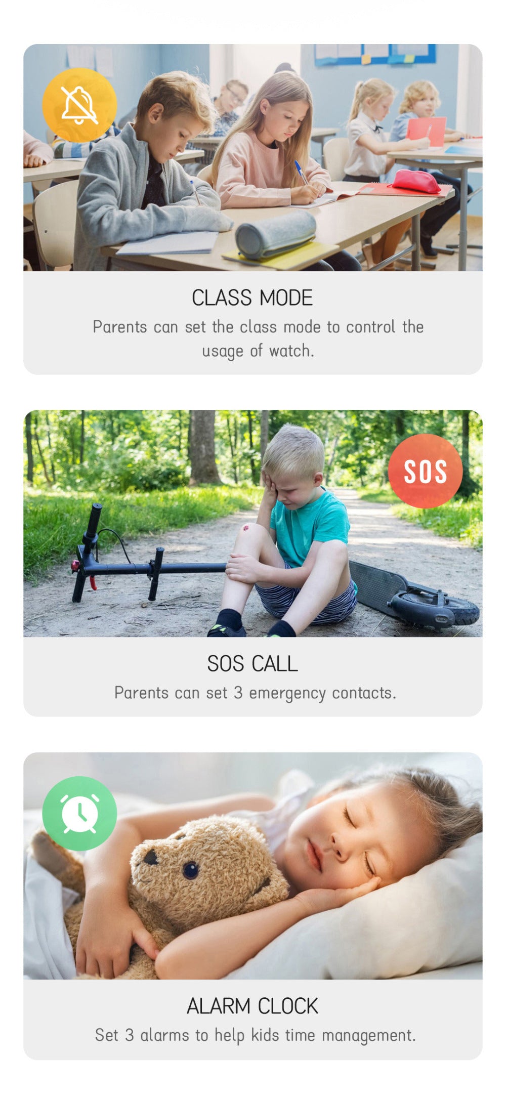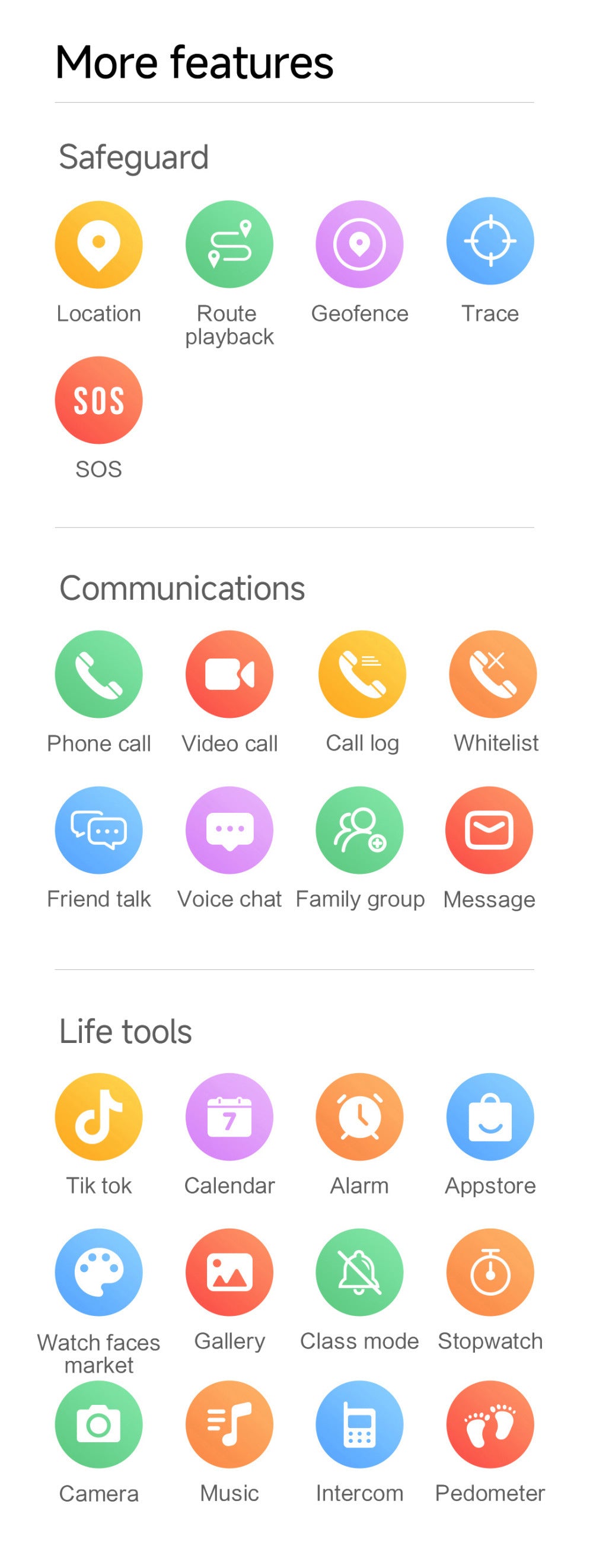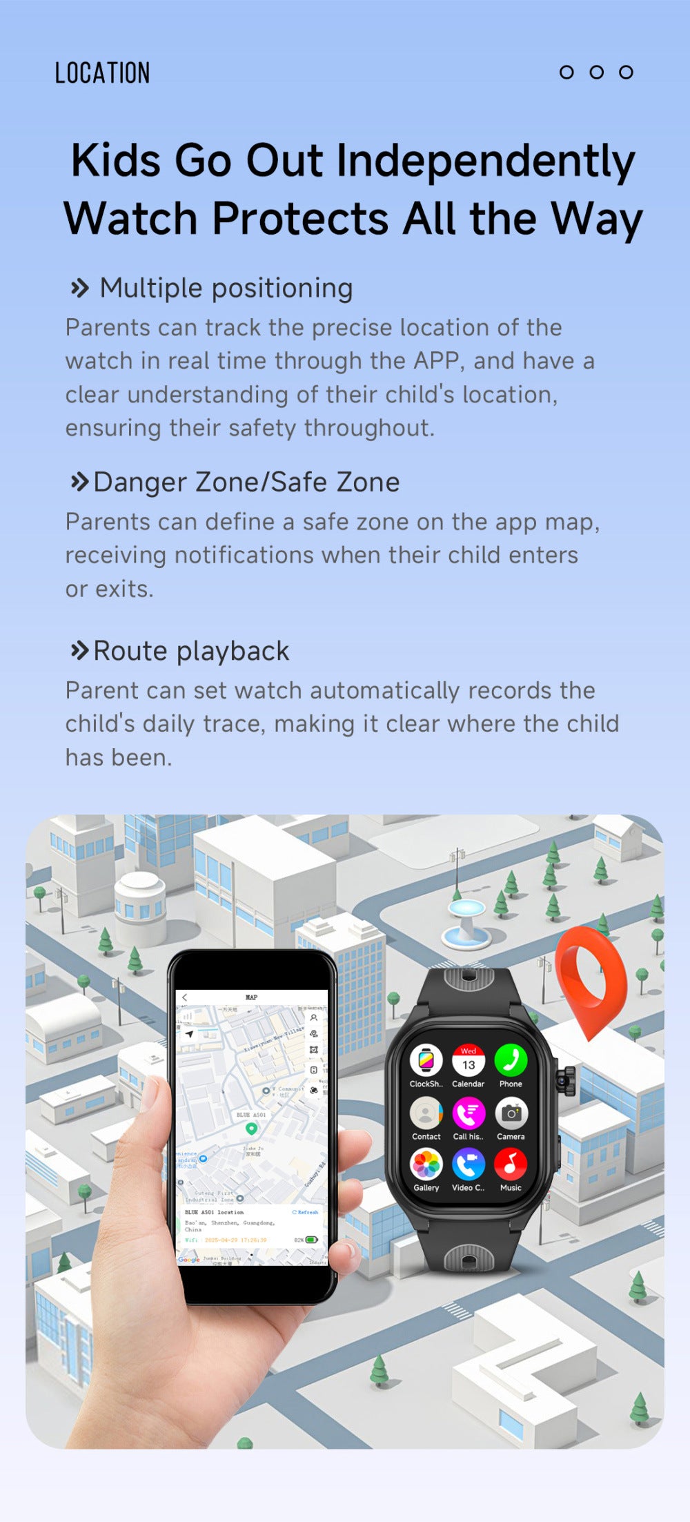 | Function | Two-way communication Android System GPS+LBS+GSM+A_GPS +WIFI positioning Receiving SMS One key SOS One key listening GEO-fence Pedometer Alarm clock Sleeping monitoring Anti lost Colour touch screen IPX7 water proof Android system Supports downloading software |